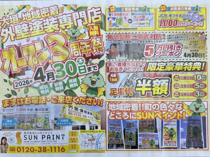 晴天の日は、心地よい風が吹いて過ごしやすいですね。 本日は、SUNペイント”オープン3周年祭”開催のお知らせです! 大垣市、瑞穂市、揖斐郡、安八郡、本巣のみなさまこんにちは!岐阜県大垣市の外壁塗装・屋根塗装専門店 SUNペイントです☆ SUNペイントはオープンから”3周年”を迎えました。 3周年を迎えられたのも、ひとえに地域のみなさま、そして私たちを信じて大切なお家を任せてくださったお客様のおかげです。 そこで、SUNペイントでは 特別なイベントを開催させていただきます!   【オープン3周年祭キャンペーン概要】 開催期間:2026年4月30日(木)まで 場所:SUNペイント 墨俣本店ショールーム、大垣中央ショールーム 期間中は、ご来店・お見積り、それぞれで特典をご用意しております。 【来店特典】 ショールームへ初めてお越しいただき、アンケートにご記入いただいた方には、必ず以下のどちらかの特典をプレゼント! ①生活用品詰め合わせセット ②サイコロの出た目の数だけ、カップ麺プレゼント ご家族で楽しめる、3周年祭ならではの特典です。   その他にも、「お見積り特典」などご用意してお待ちしております!   SUNペイントの”オープン3周年祭”は、外壁や屋根の塗装をご検討されている方もちろん、塗装時の疑問や不安な点を解消するのにも最適なイベントです。   4月30日(木)までの期間限定ですので、ぜひこの機会にSUNペイントショールームへお越しください。 お客様に最適な塗装プランをご提案できるよう努めてまいります! みなさまのご来店を心よりお待ちしております⭐   最後になりますが、これからも地域のみなさまにとって身近で頼れる存在になれるよう、日々成長していけるよう取り組んでまいりますので、4年目のSUNペイントもどうぞよろしくお願いいたします!     本格的な塗装シーズン!お問い合わせが増えています。 色選びのお悩みも、専属カラーコーディネーター在籍で安心! 火災保険など、申請のお手伝いもお任せください。 ぜひこの機会をお見逃しなく!!   ご相談はフリーダイヤル0120-38-1116 お問い合わせフォームからは24時間365日受付していますので、お忙しい方にもご対応可能です。   「LINE他社見積もり無料鑑定」始めました公式LINEで不安を解消しましょう!   ●SUNペイント墨俣本店ショールーム   県道31号線沿いにある、ドラッグユタカ墨俣店さんのお隣です。 大垣市墨俣町二ツ木190番地 フリーダイヤル 0120-38-1116 営業時間:10:00~16:00 定休日:水曜・第3日曜   ●大垣中央ショールーム 大垣市南頬町1丁目147番地1 営業時間:10:00~16:00 定休日:水曜・日曜 ぜひお待ちしております!   SUNペイントは外壁塗装専門店です。 地域密着だからこそ実現できる適正価格で高品質な外壁塗装をご提供いたします。雨漏り診断もお任せください。 相談件数3000件以上!これまで積み重ねてきた信頼と実績に恥じぬよう、誠心誠意対応させていただきます。   SUNペイント施工事例はこちらから!   外壁塗装を依頼したいけど、色のイメージが湧かない・・」 そんな方は、カラーシミュレーションの前にこちらをご覧ください。 カラーコーディネーターも在籍しています!カラーシミュレーション歴15年以上! 当店が色選びを徹底サポートいたします! お見積もり・ご相談はSUNペイントまで。 不安な点や、気になる事は今すぐ解消しましょう。   SUNペイントではご相談・現地調査・お見積り提出まで無料で承らせて頂きます!   instagram(インスタグラム)ぜひご覧ください✅