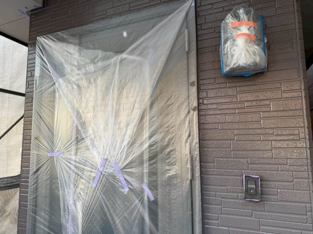 塗料の飛散防止のため、シートでしっかりと覆います。