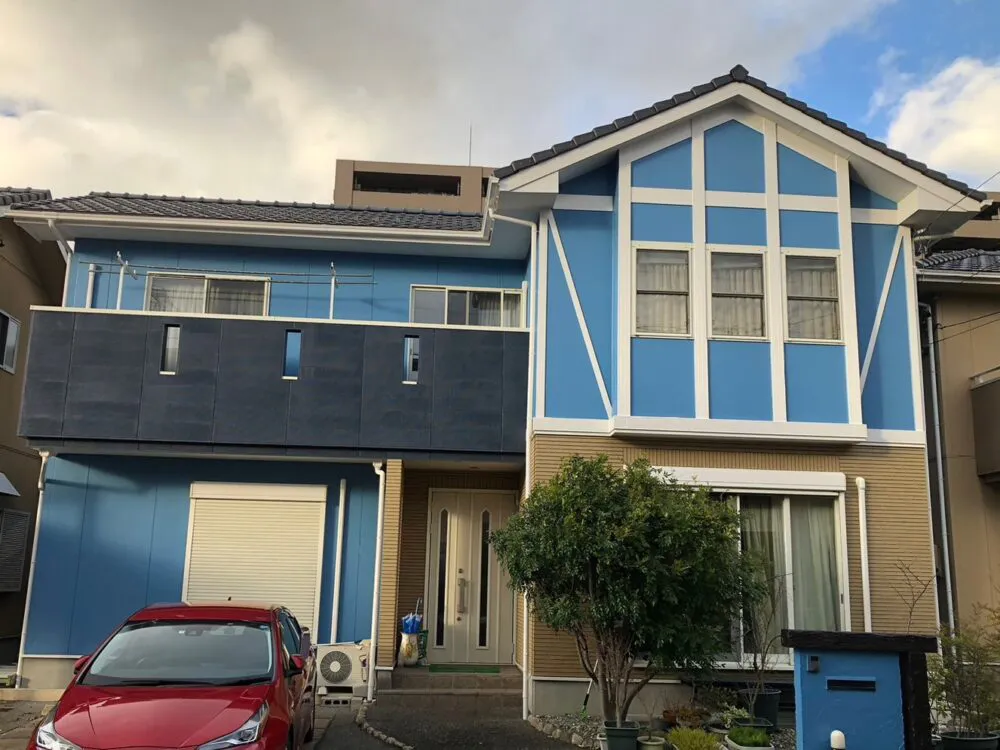 大垣市の外壁塗装 スカイブルーで海外風のお家